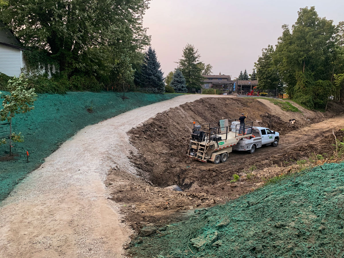 Professional hydroseeding application to restore the waterfront greenery at Belle River Marina.