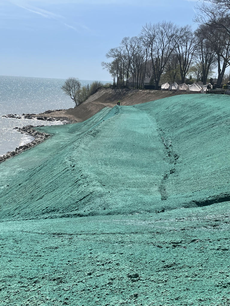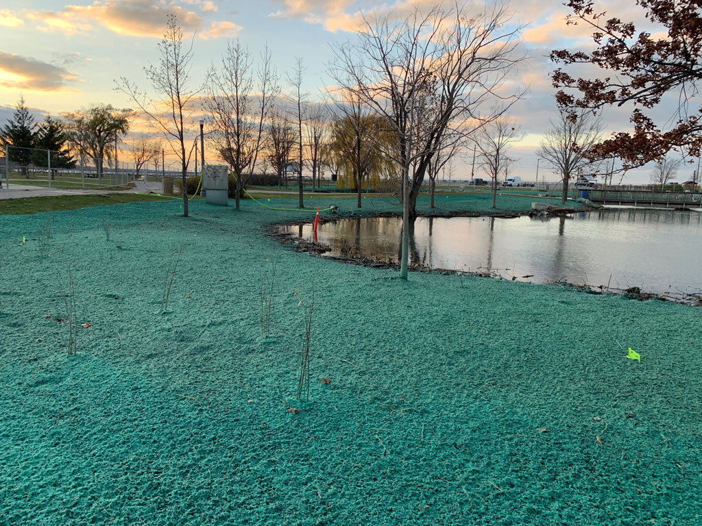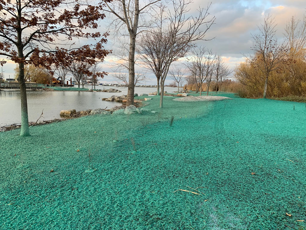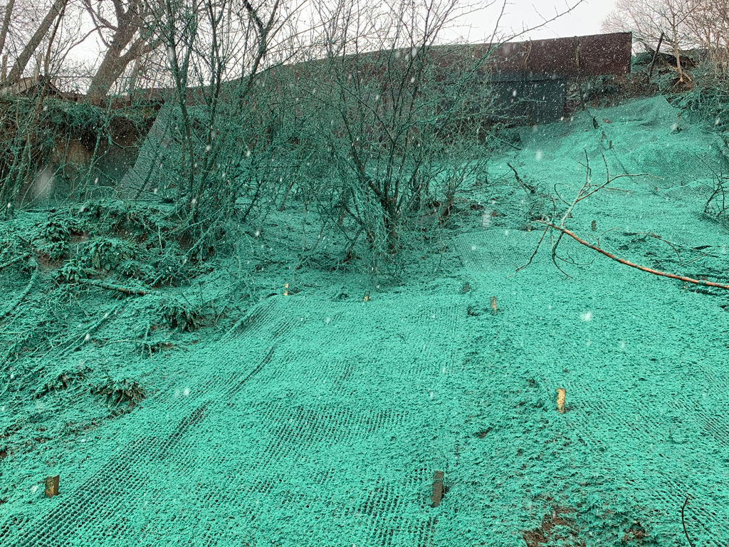 - Erosion Control Matting – Application of biodegradable or synthetic blankets to hold soil in place on slopes until permanent vegetation is established.
